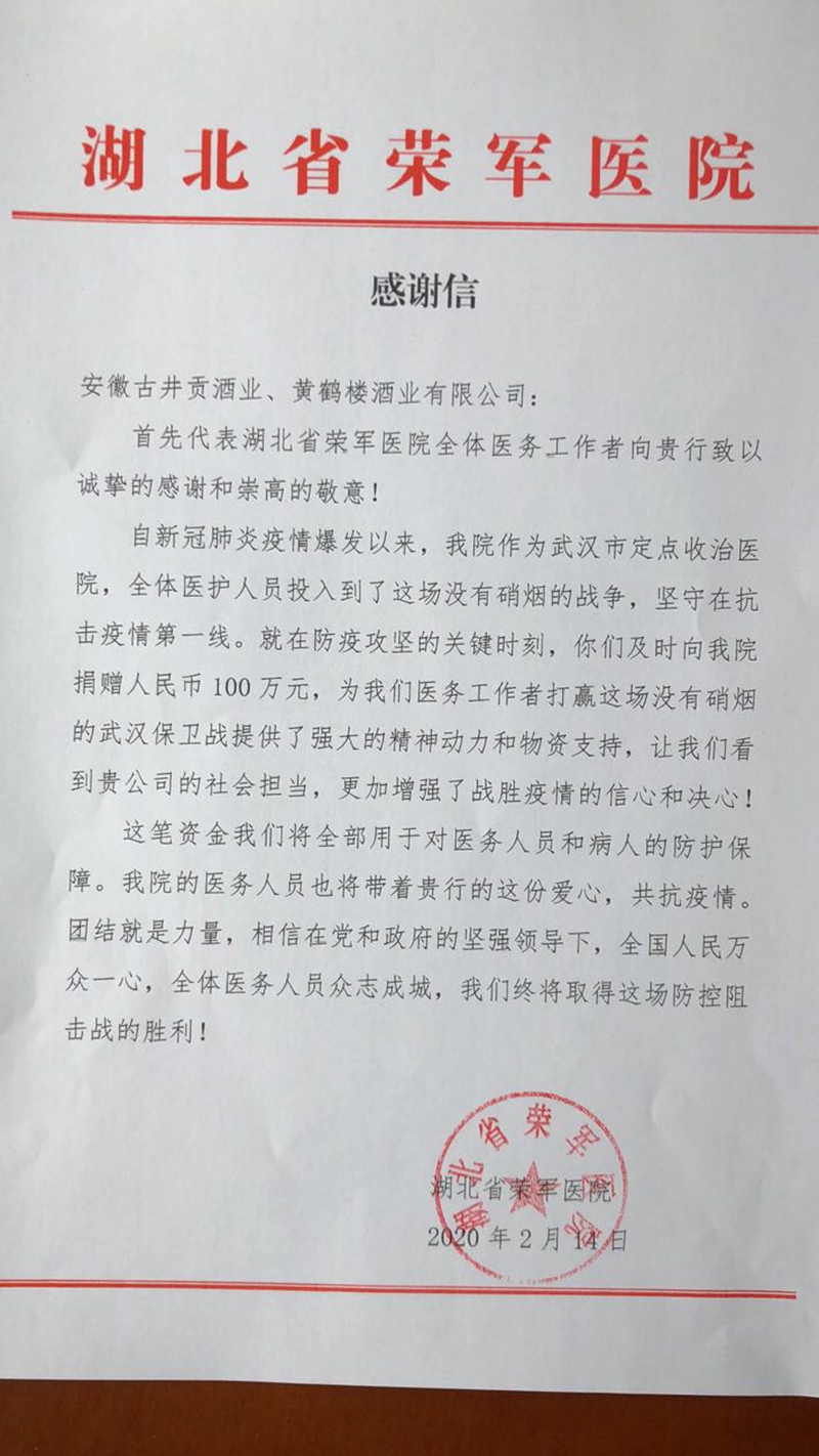 2月14日,一封來自湖北省榮軍醫院的感謝信送到黃鶴樓酒業,表達了對安徽古井貢酒業、黃鶴樓酒業的感謝。