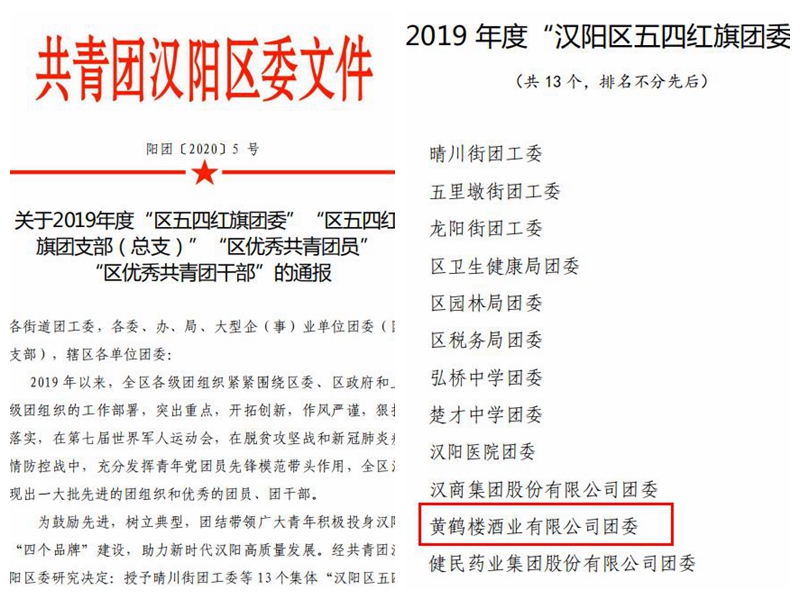 近日,黃鶴樓酒業團委榮獲2019年度“漢陽區五四紅旗團委”,武漢行政團支部獲古井集團“優秀團支部”榮譽稱號。公司生產管理中心付子傲榮獲漢陽區“優秀團員”稱號,業務管理中心王逸凡榮獲古井集團“優秀團員”稱號。
