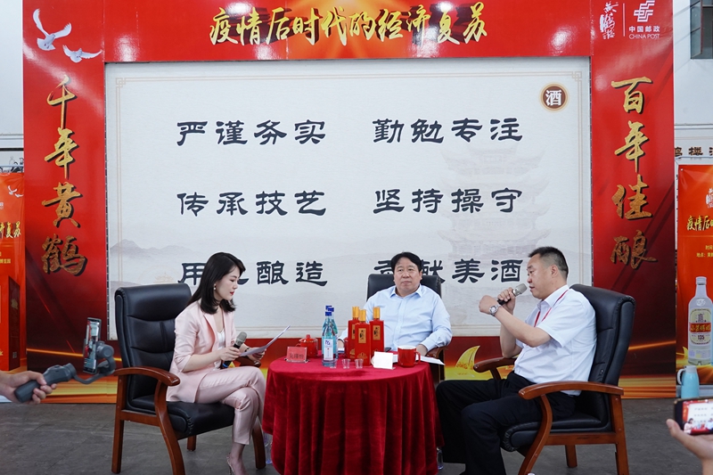 隨后,任永信、許鵬、吳瑾言在天成坊釀造車間以線上抖音直播與線下座談相結合的方式,就“疫情后時代的經濟復蘇”為主題展開討論。許鵬表示,一直以來,黃鶴樓酒堅持從選糧源頭開始把控產品品質,建立糧食基地,確保產品質量。后疫情時代,有危就有機,黃鶴樓酒業將以良心品質、良心服務回饋社會、回饋消費者。任永信表示,文化關鍵在化,管理重在于理,后疫情時代,以文化人以文化心,思想要有流動性,社會要有責任心,敬天愛人,用溫度和能量促進社會發展。同時,任永信對黃鶴樓酒提出純、正、清、香的四字評價,他表示,與其等待不如乘勢而上,黃鶴樓酒業帶著感恩之心與奮進之心釀造出精品好酒,堅守傳統工藝,傳承楚酒文化。