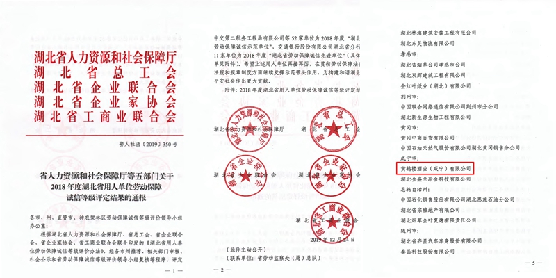 近日,經湖北省人力資源和社會保障廳等五部門評定,黃鶴樓酒業(咸寧)有限公司被授予“2018年度湖北省用人單位勞動保障誠信示范單位”稱號。
