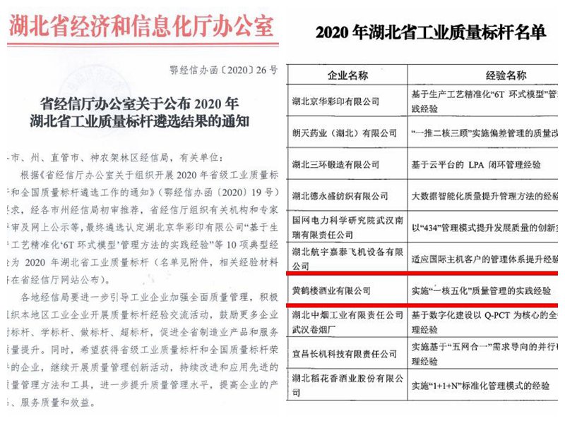 近日,湖北省經(jīng)信廳公布2020年湖北省工業(yè)質(zhì)量標桿遴選結(jié)果,黃鶴樓酒業(yè)提報的“實施‘一核五化’質(zhì)量管理的實踐經(jīng)驗”榮獲湖北省質(zhì)量標桿。