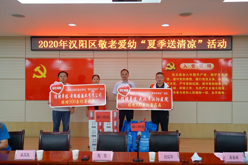 捐贈(zèng)儀式上,劉漢華,趙亮為活動(dòng)致辭,易喜祥、麻玉俠代表愛(ài)心企業(yè)作分享發(fā)言。黃鶴樓酒業(yè)和武漢市漢陽(yáng)醫(yī)院分別向漢陽(yáng)區(qū)敬老愛(ài)幼“夏季送清涼”活動(dòng)捐贈(zèng)300套防暑飲品和300套防暑藥品,劉漢華,趙亮代表社區(qū)困難群體接受捐贈(zèng)。