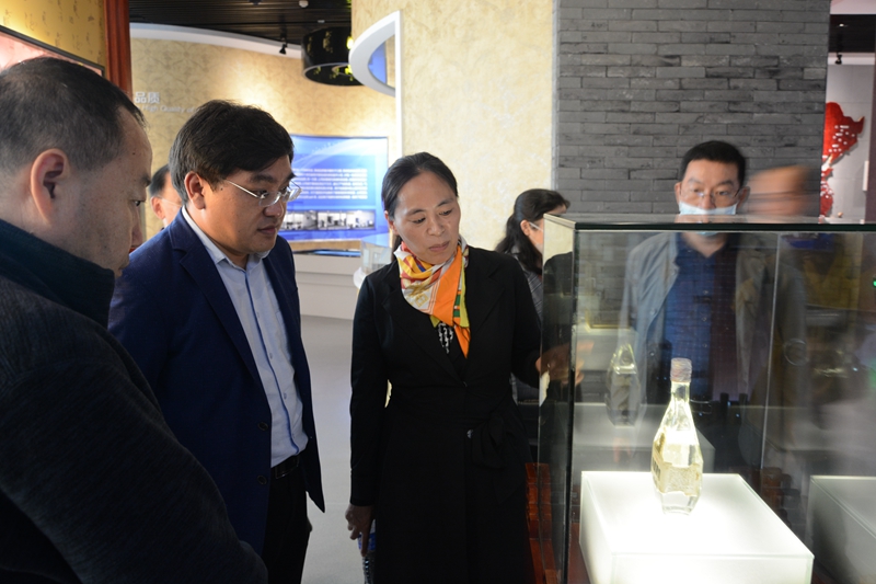 張廷一行先后參觀了景區的商貿中心、黃鶴樓酒文化館、美酒銀行、洞釀第一坊、酒香花果山等景點。在黃鶴樓酒文化館,麻玉俠向張廷一行介紹了黃鶴樓酒業悠久的發展文化史,并對黃鶴樓酒兩獲“中國名酒”稱號的特制黃鶴樓進行詳細講解。