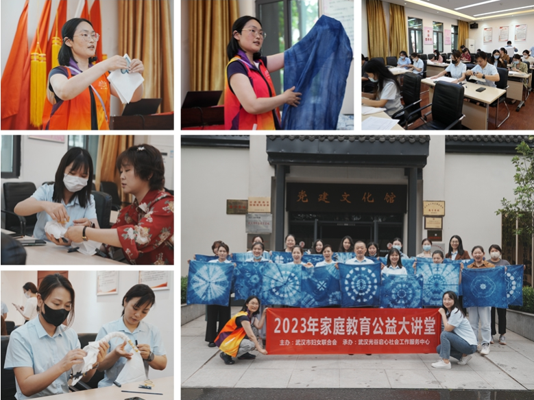 本次活動邀請武漢光谷啟心社會工作服務(wù)中心老師進(jìn)行指導(dǎo)?;顒娱_始,老師向大家介紹了扎染的歷史與傳承,隨后老師現(xiàn)場演示幾種扎染花紋的扎節(jié)方式以及操作技巧,扎節(jié)時松、緊、疏、密的不同,使得扎染成品花色圖案千差萬別,絢麗多姿。隨后,參會人員紛紛發(fā)揮著自己的想象力創(chuàng)造力,扎染出屬于自己獨一無二的花紋。