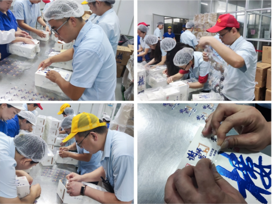 為確保樓20謝恩師定制產品順利生產上市,生產黨支部、財務審計黨支部響應號召,充分發揮黨員先鋒模范作用,開展產品貼標活動。時間緊、任務重,黨員們在車間工作人員指導下有序進行貼標,埋頭苦干、一絲不茍,與一線員工齊奮斗,本著不浪費一張標,不貼花一個盒子原則,保質保量完成任務。