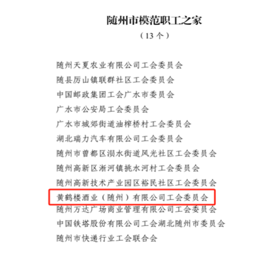 12月26日,黃鶴樓酒業(yè)(隨州)有限公司工會(huì)委員會(huì)榮獲2023年度隨州市“模范職工之家”榮譽(yù)稱號(hào)。