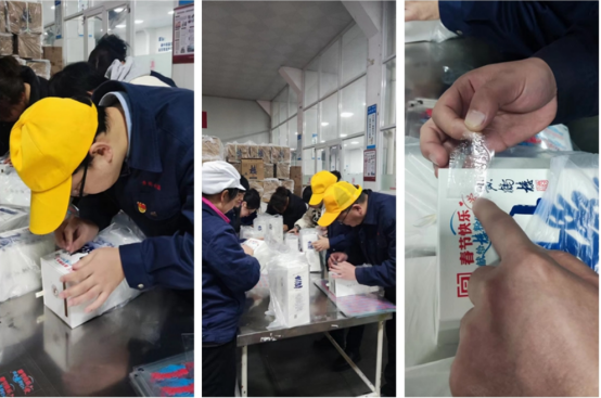 正逢年底生產旺季,為確保春節定制版產品順利交付,生產黨支部響應號召,積極發揮黨員先鋒模范作用,開展產品貼標活動。時間緊、任務重,在車間工作人員指導下,大家有序進行,埋頭苦干、一絲不茍,與一線員工齊奮斗,本著不浪費一張標,不貼花一個盒子原則,保質保量完成任務。