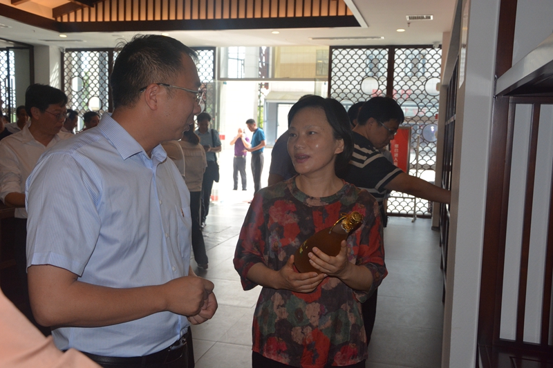 閆英姿一行參觀了商貿中心、黃鶴樓酒文化館、美酒銀行,在商貿中心,閆英姿對景區獨有的“香城壹號”桂花清酒展現出濃厚興趣,李良分別從口感、釀造技藝、優質原材料等方面作出詳細介紹。