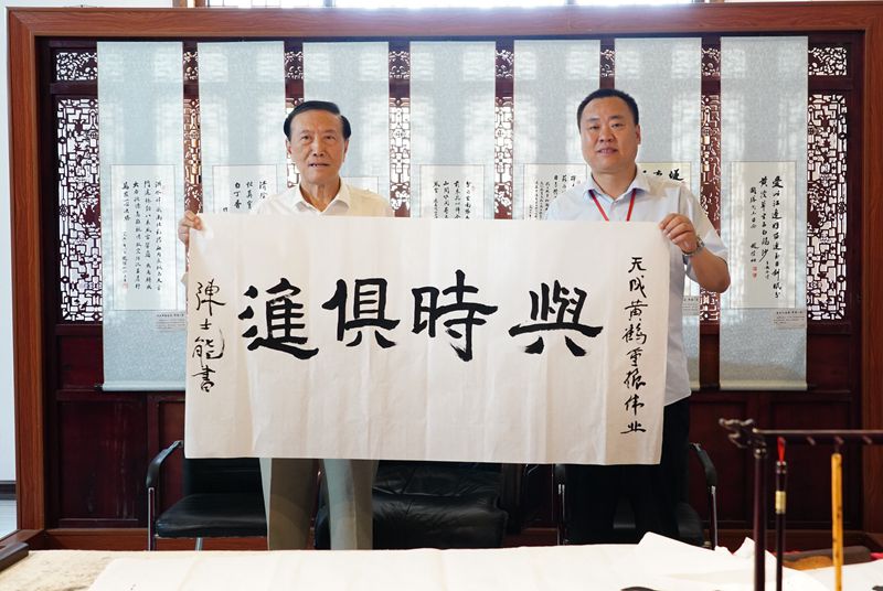 在黃鶴樓酒文化博物館,陳士能一行了解楚酒源流,感受楚文化魅力,并現場揮毫潑墨,贈與黃鶴樓酒業“與時俱進”四字勉勵,祝愿黃鶴樓酒業重振偉業。