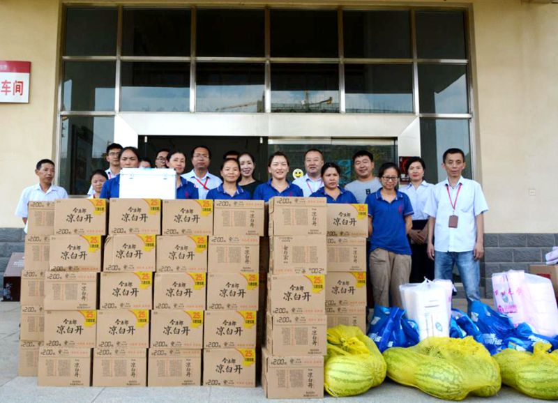 朱明鳳一行給黃鶴樓酒業員工送來了礦泉水、西瓜、醫藥箱及毛巾等物資,并對員工的工作和生活情況表示關心與關愛。