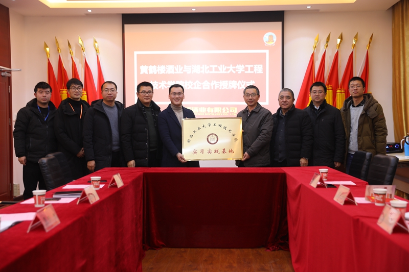 1月7日,黃鶴樓酒業與湖北工業大學工程技術學院實踐基地授牌儀式在黃鶴樓酒業舉行。湖北工業大學工程技術學院院長張業鵬,教務部長黃科,辦公室主任李陽,生化工程系主任屈廷啟,黃鶴樓酒業生產管理中心總監陳彥龍、咸寧分廠廠長李良,人力資源中心總監助理張佳參加授牌儀式。
